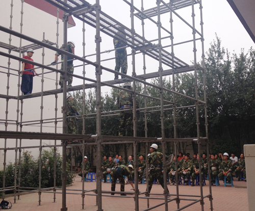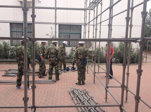 顶烈日,冒酷暑,60多名建筑专业男工在外经公司出国人员培训中心进行脚手架训练,为出国工作打下坚实的基础。